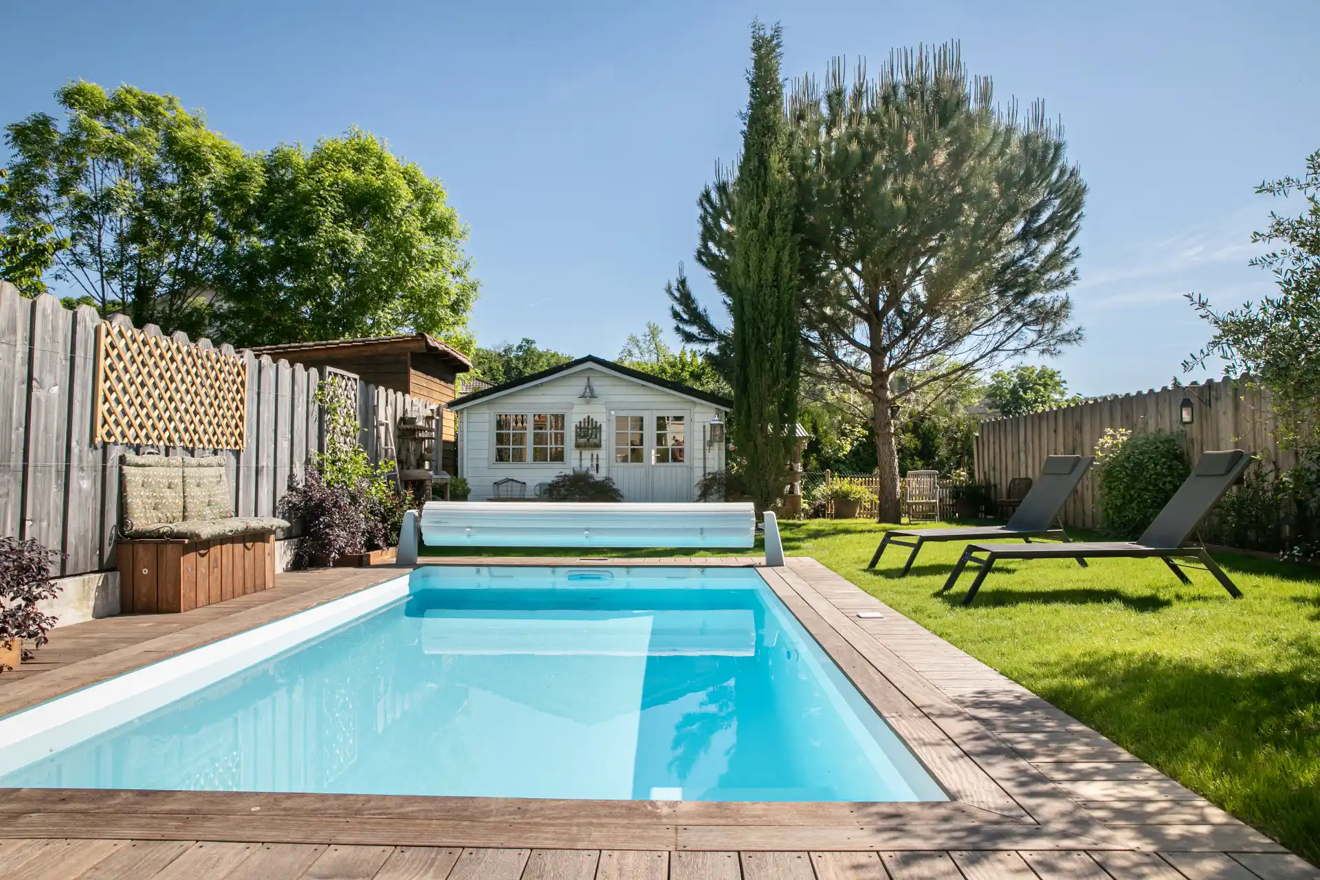 Piscine rectangulaire turquoise dans un jardin avec cabanon blanc, transats et clôture en bois Piscine rectangulaire bleue entourée d’une grande terrasse en bois avec transats et mur blanc Piscine rectangulaire turquoise sur terrasse en bois avec transats blancs et petite maison en pierre Vue aérienne d’une piscine rectangulaire turquoise avec escalier sur terrasse en bois et pierre